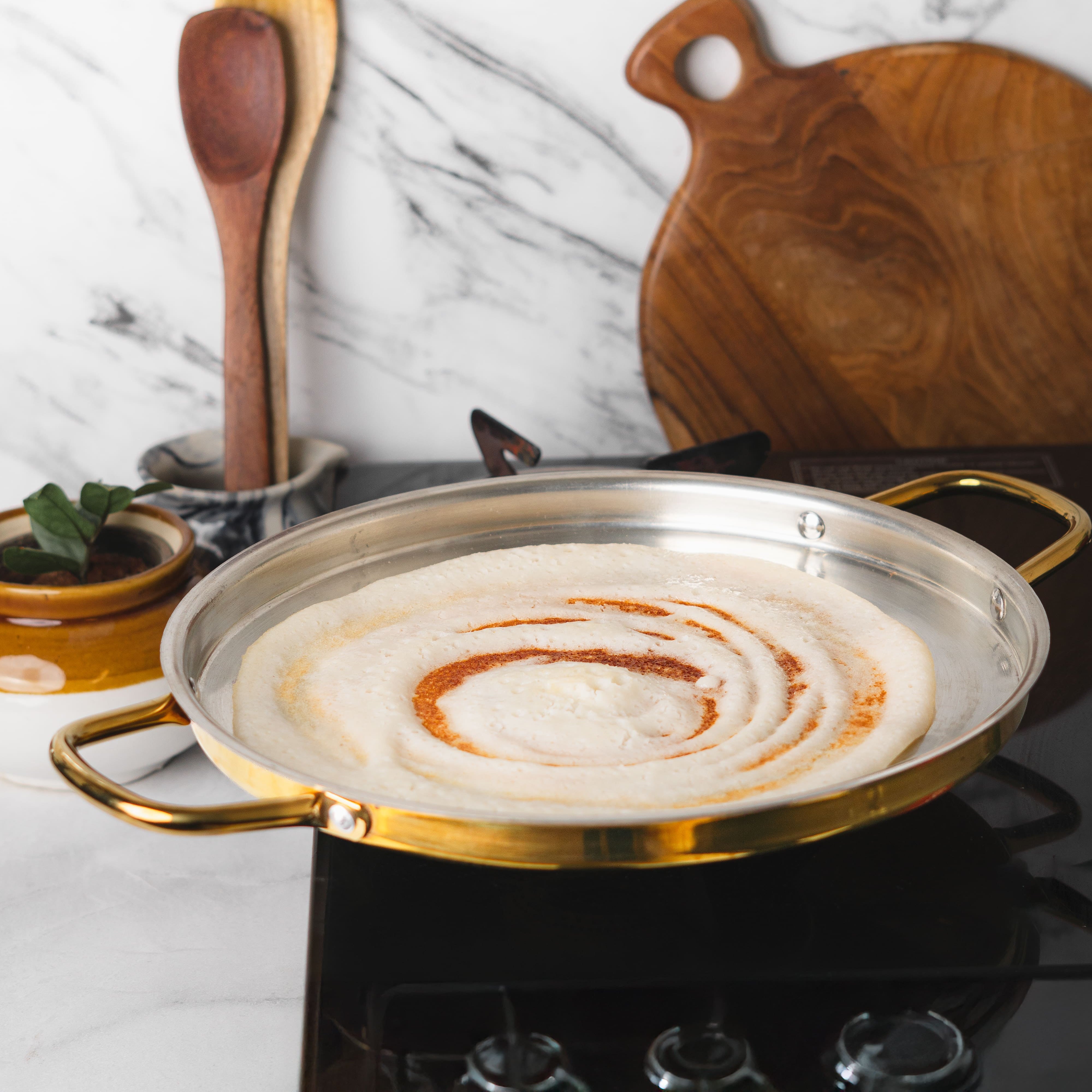 Lovingly crafted from 100% pure brass and lined with food-grade Malaysian tin (kalai), this dosa tawa and ghee pot combo is free from toxins and synthetic coatings, nurturing your body with every meal and supporting digestive health the way nature intended.