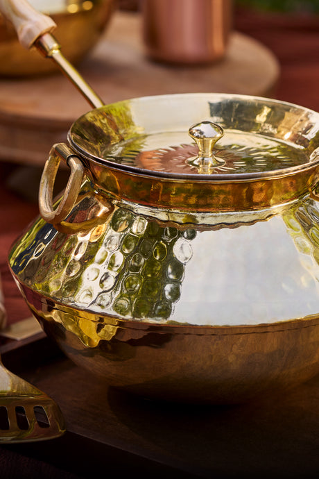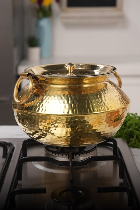 Cook with a classic brass patili to savor the ideal harmony between history and modern cuisine. Perfect for cooking anything from robust stews to delicious rice dishes, this adaptable cookware is well made to offer uniform heat distribution. Strong and beautifully crafted, it offers classic workmanship to your kitchen so that every meal honors flavor and tradition.