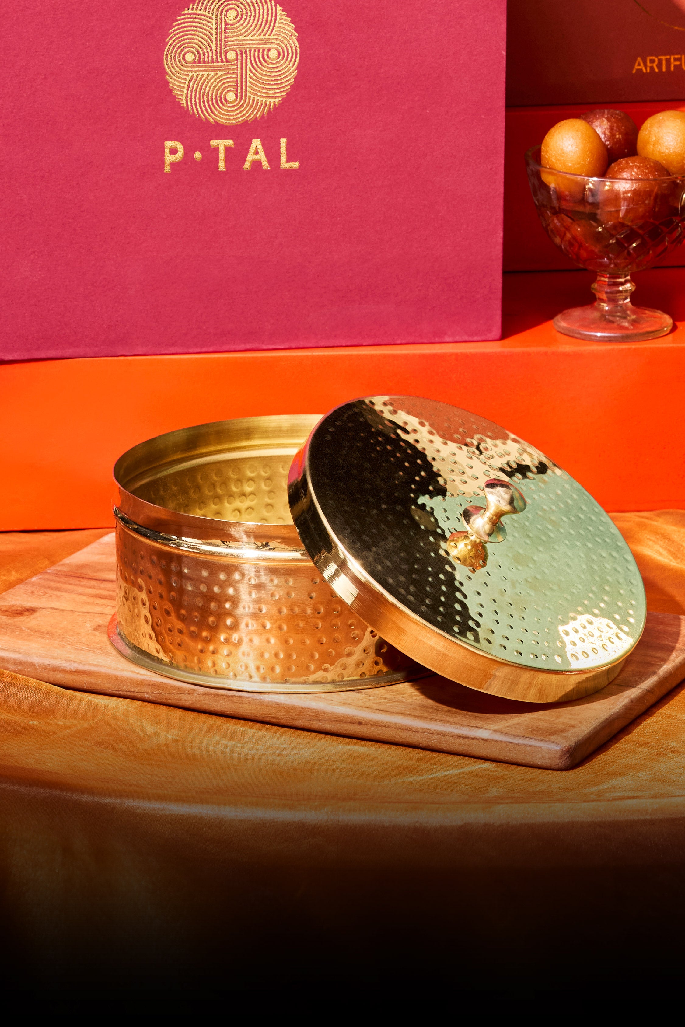 Wrap warmth, nourishment, and tradition into every meal with this beautifully handcrafted Brass Chapati Box. Designed to keep breads soft and fresh for longer, it carries both purpose and poetry. The hammered brass exterior glows with heritage, while the food-safe interior preserves not just food—but the love with which it was made. A quiet centrepiece for shared meals and timeless rituals.