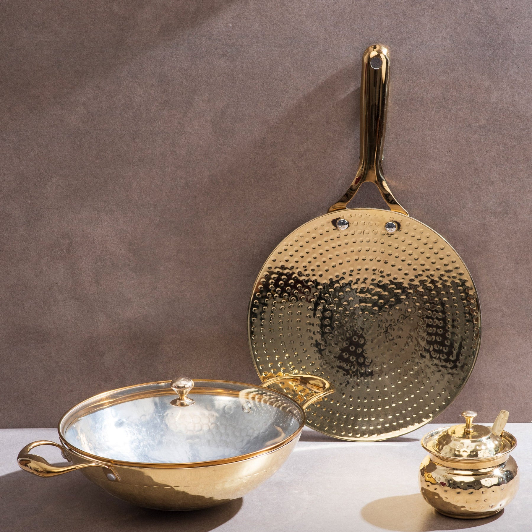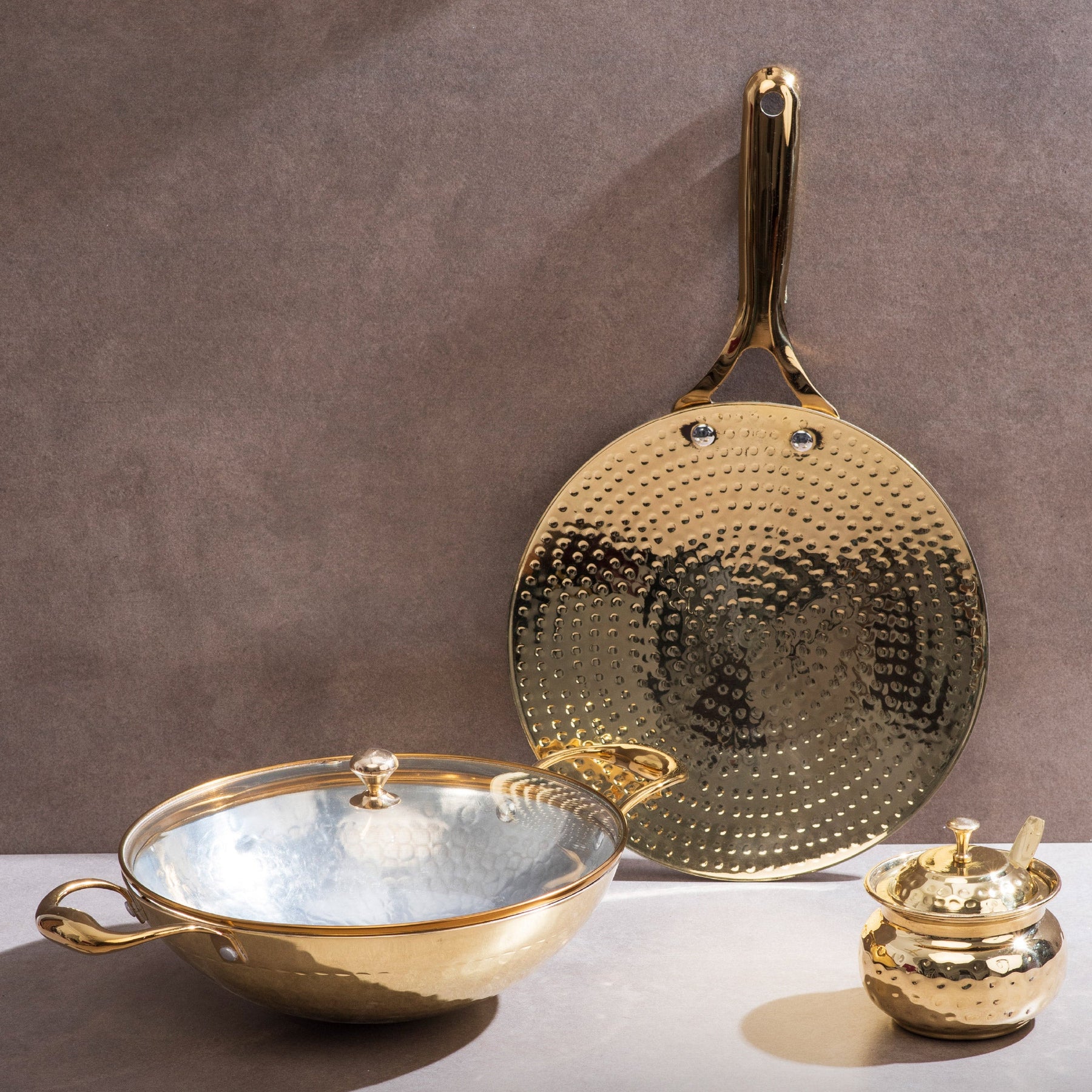 Brass Essentials Combo Set (Brass Roti Tawa with Insulated handle, Brass Ghee Pot, Brass Kadhai with Insulated handles & Glass lid)