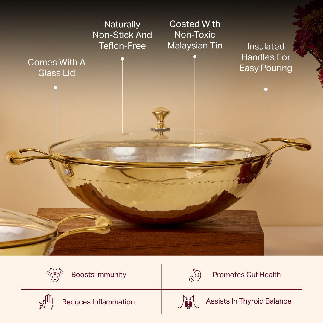 Lovingly crafted from 100% pure brass and lined with food-grade Malaysian tin (kalai), this kadhai is free from toxins and synthetic coatings, nurturing your body with every meal and supporting digestive health the way nature intended.