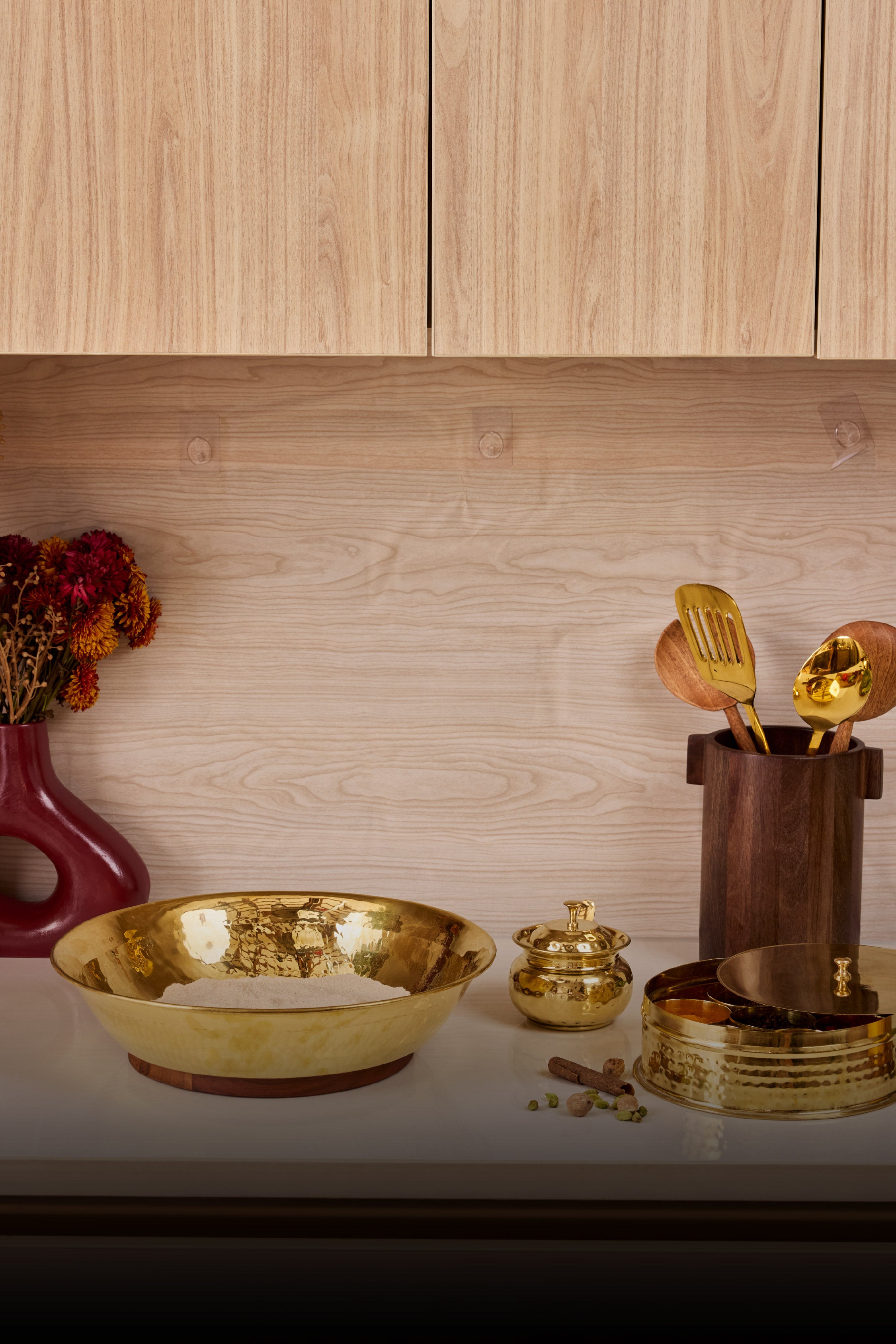 Using P•TAL's Kitchen Essentials Set, honor the unassuming heroes in your kitchen. Combining the classic Paraat, the exquisite Ghee Pot, and the rustic Masala Box, this trio offers form, use, and legacy together in one thoughtful collection. Designed to enhance daily rituals and festive preparations, each handcrafted piece made of pure brass honors the wisdom of slower, more deliberate life. Beautiful to employ. Much better still to live with.