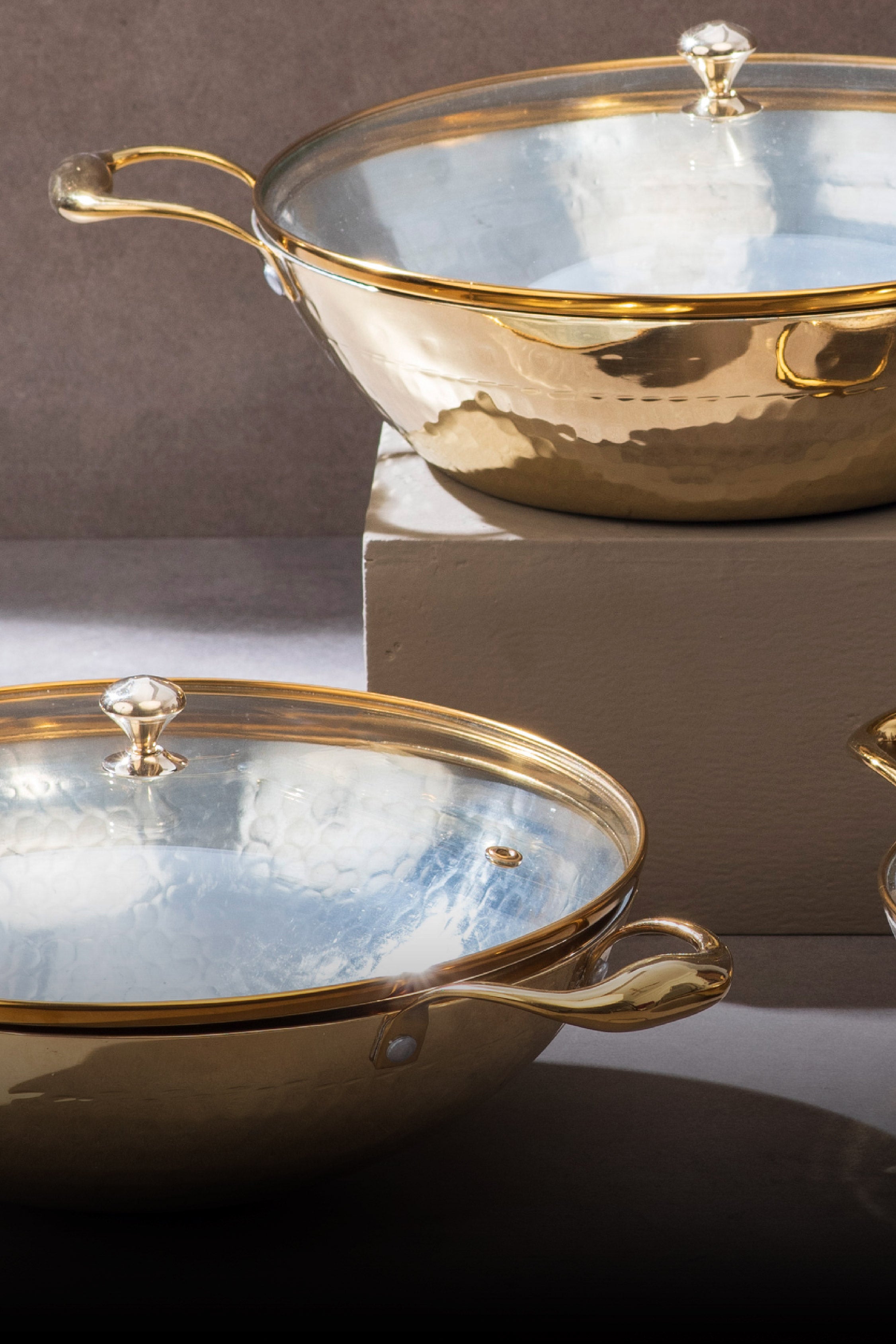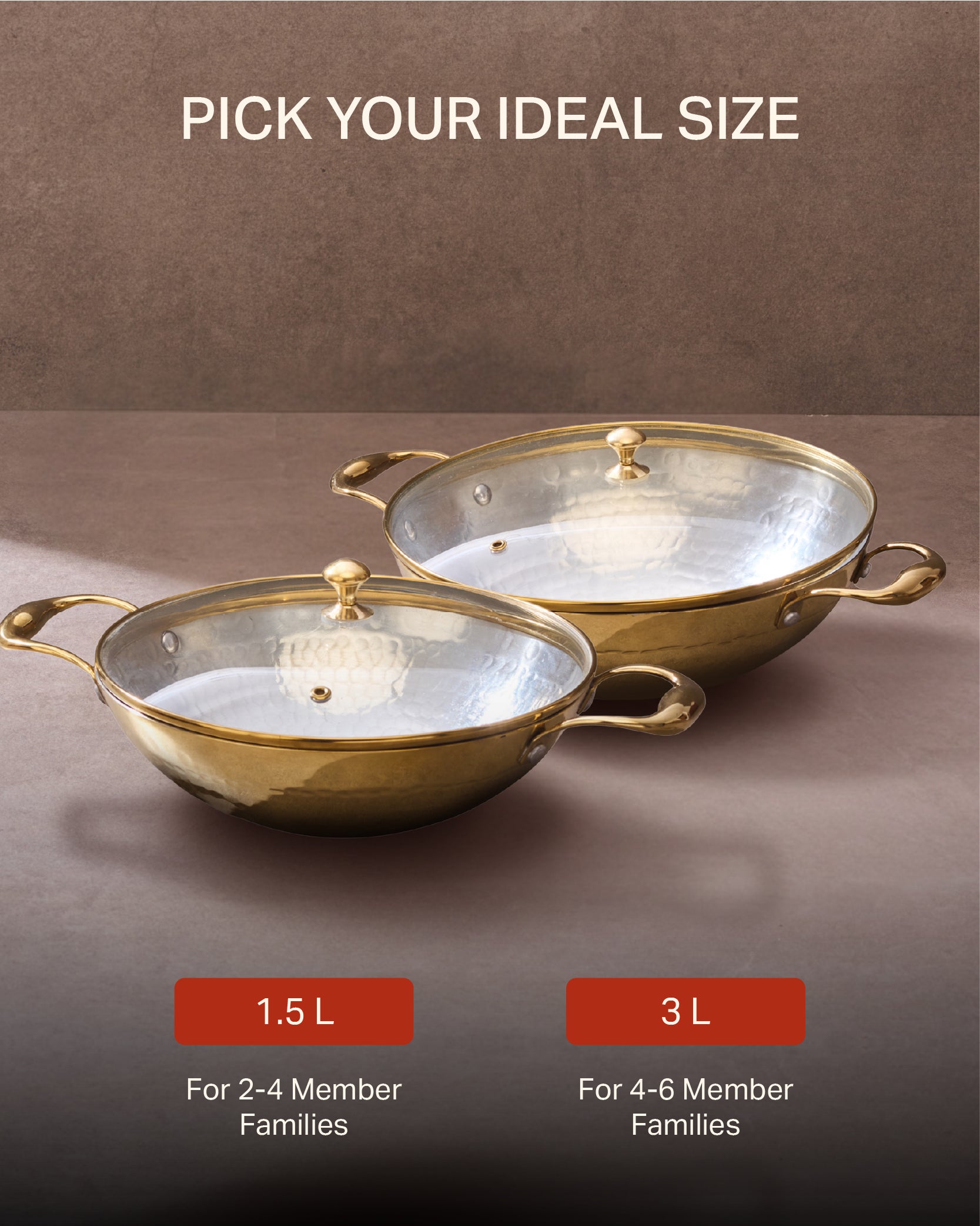 Brass Flat base Kadhai (with glass lid), Round base 1.5l Kadhai (with glass lid), Round base 3 l Kadhai (with glass lid), and Free Spatula