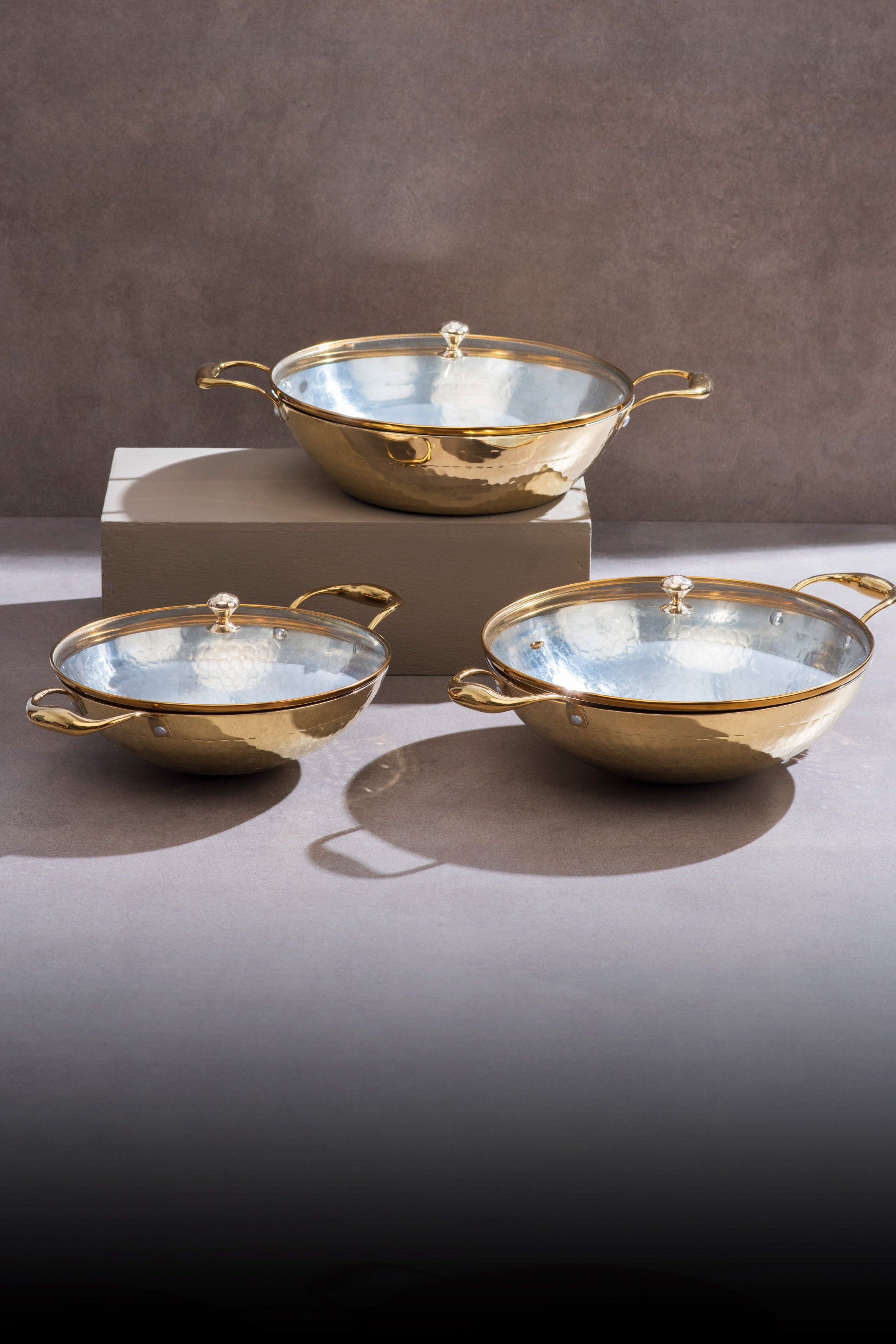 Set of 3 Brass Kadhais with Glass Lid (1.5L round base, 3L round base, 3L flat base)
