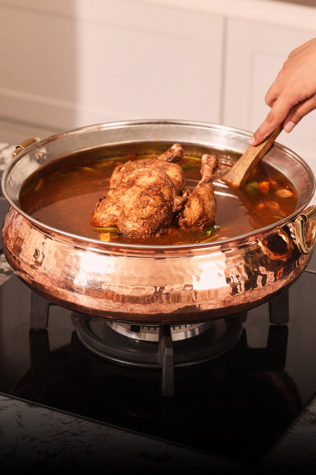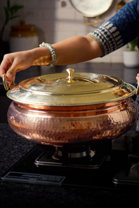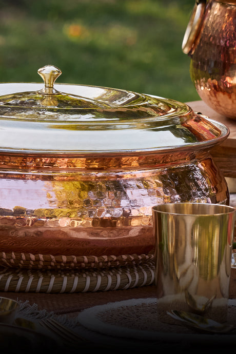 Cook in a copper-hammered lagaan and bring a touch of timeless elegance to your kitchen. Lovingly crafted and steeped in tradition, this vessel is made for slow, soulful cooking, where flavours deepen and memories simmer. Its generous form and even heat flow make it perfect for roasting, baking, or one-pot meals that deserve patience and care. With every dish, the lagaan honours the art of cooking as it once was, intentional, nourishing, and beautifully slow.