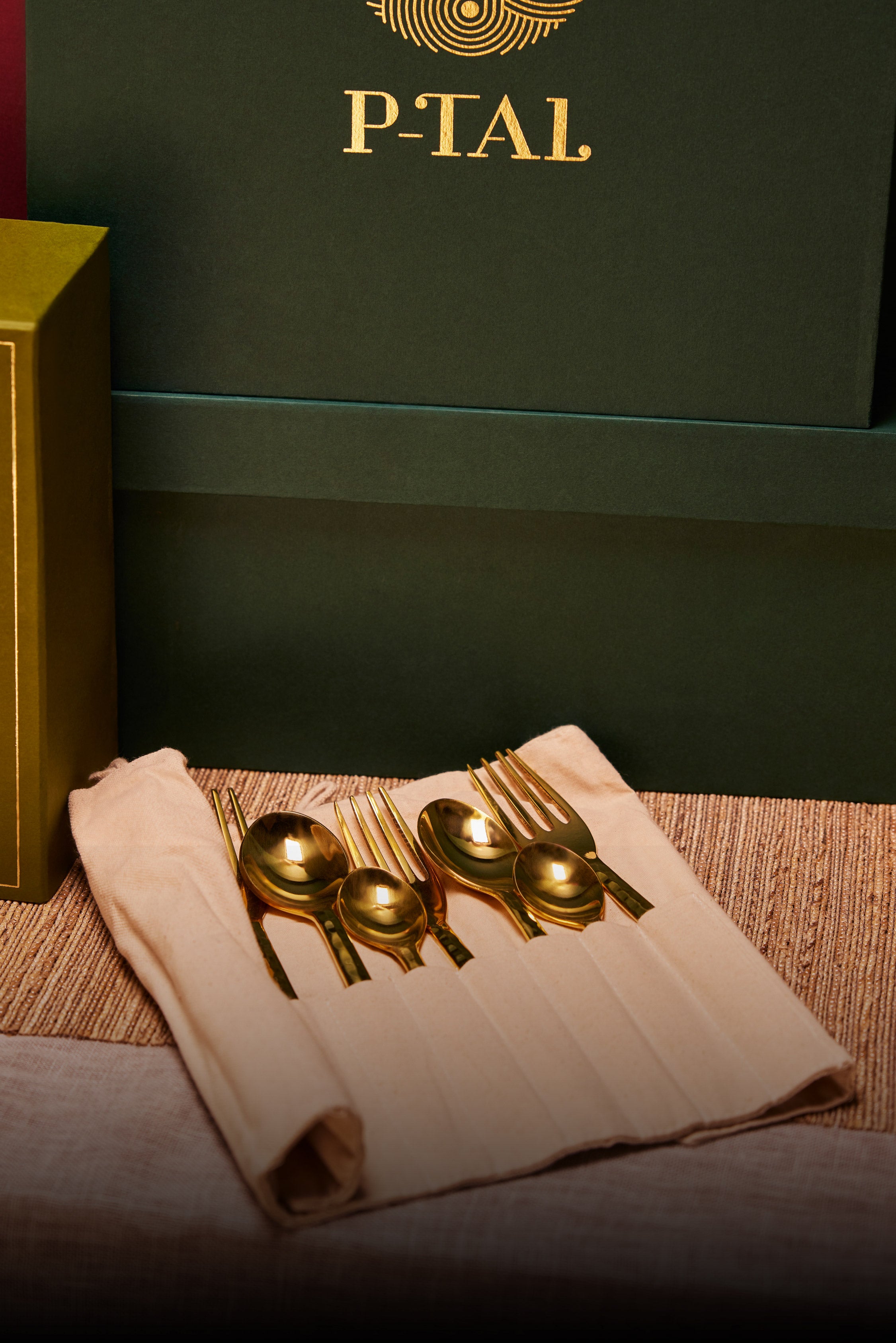 Make every meal feel like a celebration with P-TAL’s Gift Box of Engraved Brass Forks & Spoons. This thoughtfully crafted set of 6 brass forks and 6 brass spoons comes nestled in a rich maroon gift box. It is perfect for festive tables or as a timeless gift. The cutlery is hand-engraved and polished to perfection. It adds a warm, elegant charm to every bite. It ensures to blend in tradition with everyday refinement.