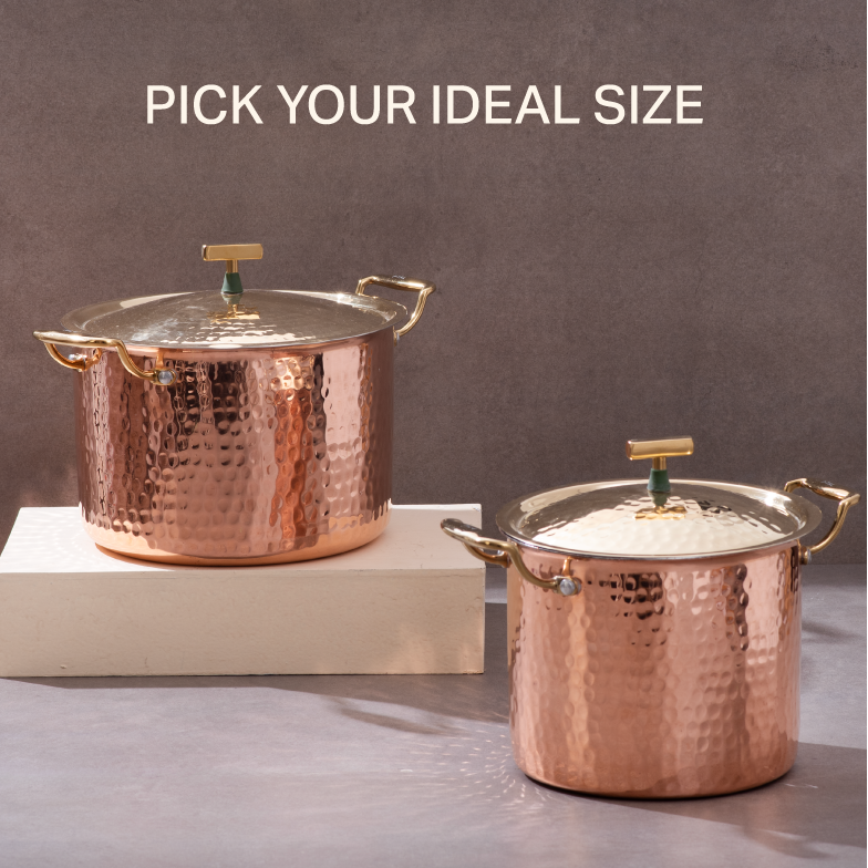 Handcrafted in solid copper and lined with food-safe tin, this stock pot is made for slow, even cooking that brings out deeper flavor with every simmer. Designed for soups, broths, stews, and hearty one-pot meals, it spreads heat evenly from base to rim so every ingredient cooks beautifully.