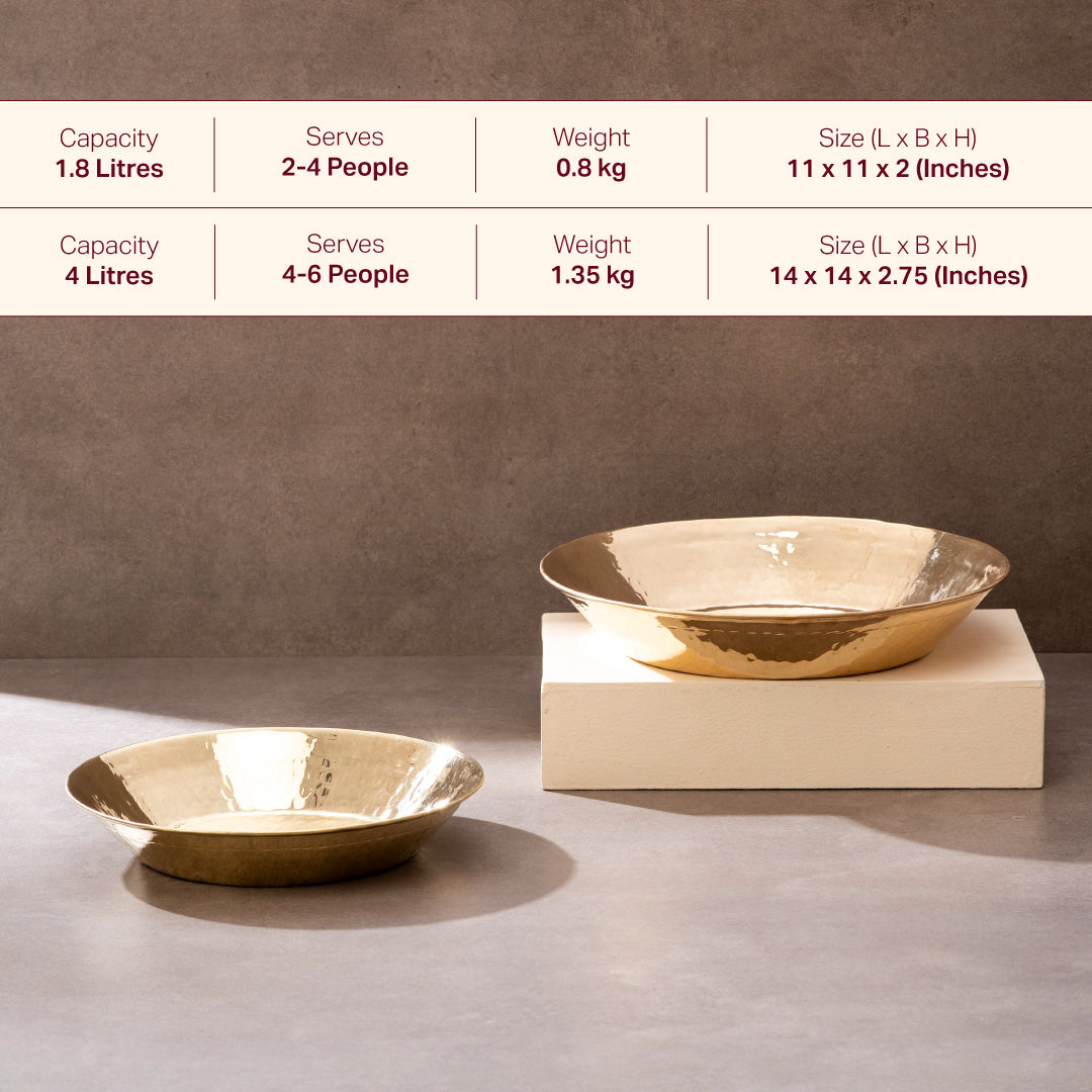 Bring tradition to your daily routine with this handcrafted Brass Paraat—designed for comfortable, efficient dough kneading. Its wide, flat base surface allows you to work with ease, while the warm golden hue and hammered detailing reflects a legacy that goes beyond the kitchen. Practical, beautiful, and rooted in Indian food heritage, this is a piece that nourishes through both purpose and presence.