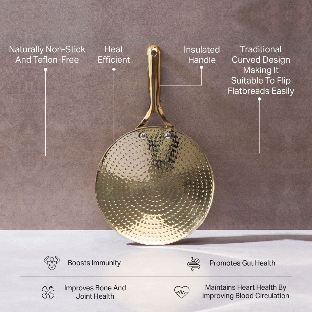 Handcrafted in pure Brass with a golden finish, the Brass Roti Tawa makes cooking a healthy and memorable experience while keeping the nutritional values intact. Moreover, the tawa's convenient size makes cooking easy while simultaneously regulating heat uniformly due to the excellent heat conductivity of Brass as a metal.