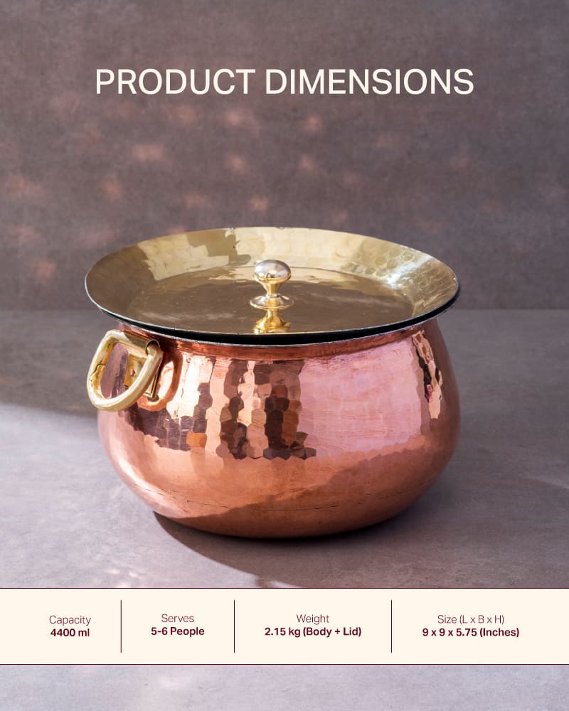 Lovingly crafted from 100% pure copper and lined with food-grade Malaysian tin (kalai), this madurai handi is free from toxins and synthetic coatings, nurturing your body with every meal and supporting digestive health the way nature intended.
