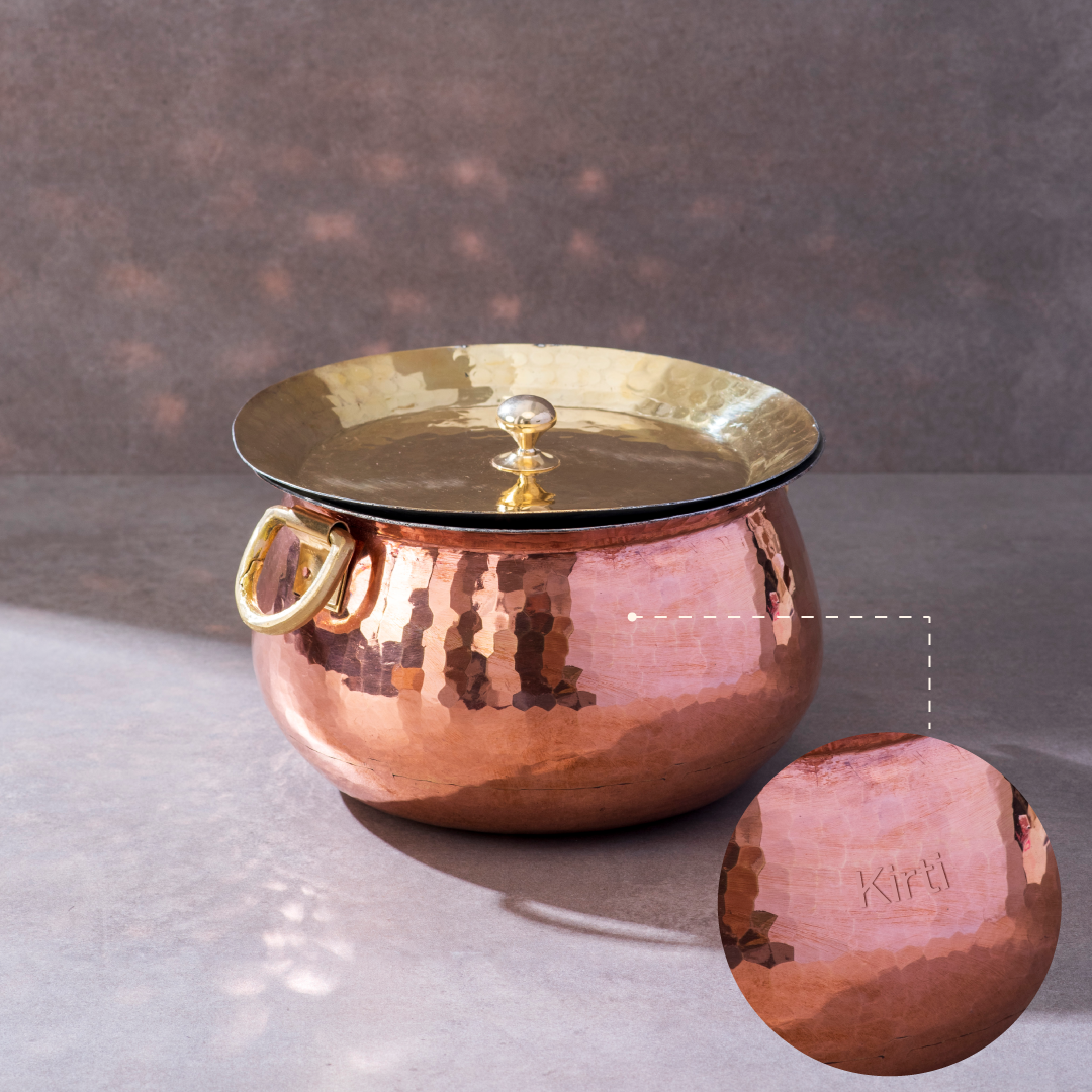 With the Copper Madurai Handi, a work where history meets clever design, improve your cooking and hospitality experience. Made in solid copper and coated with food-safe tin, this handi guarantees safe, flavourful cooking while brilliantly preserving warmth. The ring handles and snug-fit lid makes it easy to use. The hammered rose-gold finish adds a little of heritage glamour. This handi celebrates craftsmanship and culinary tradition from beautiful table service to slow-simmered cuisine.